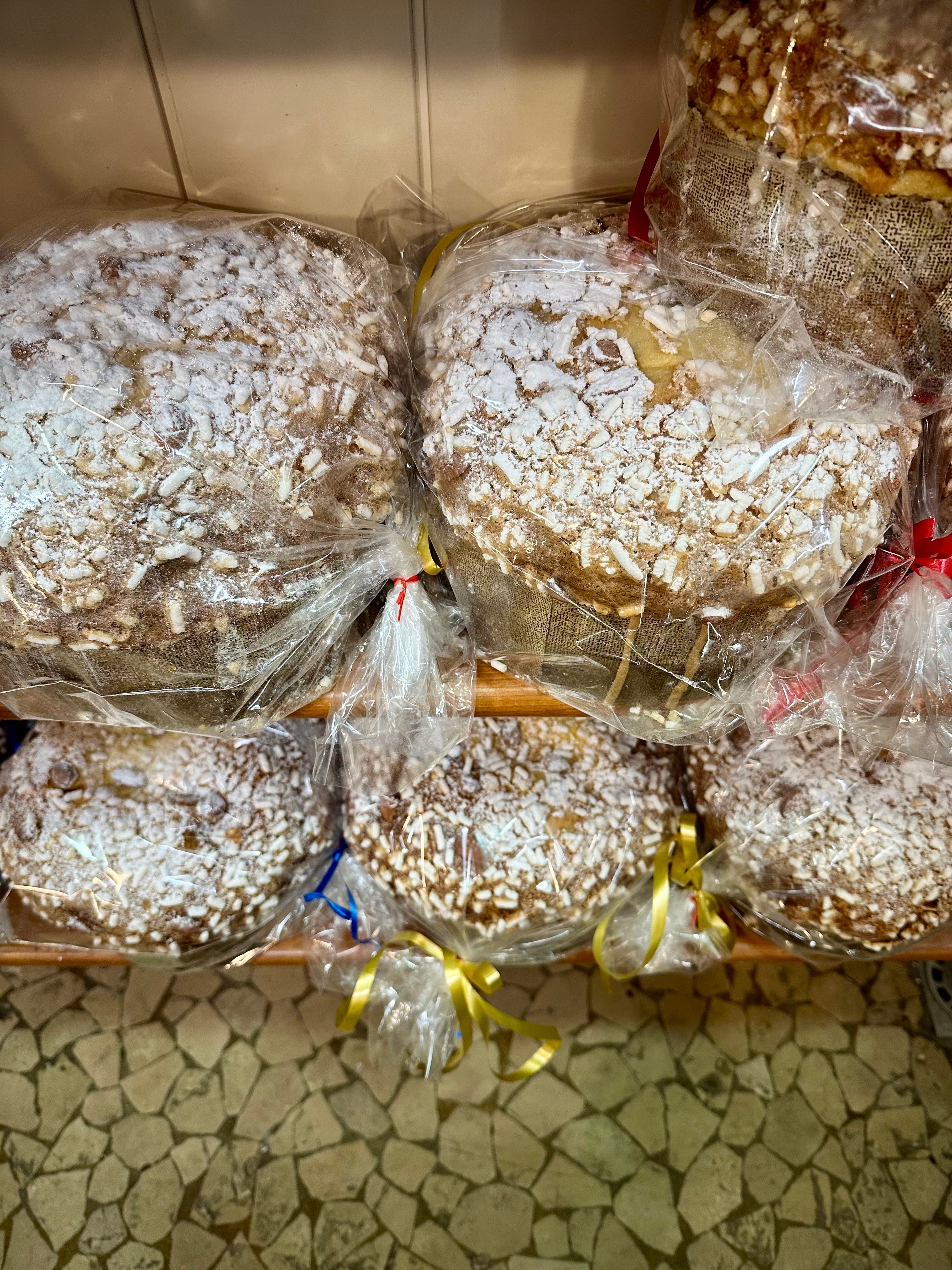 I am still pretty new to the focaccia Veneziana. Soft and fluffy like pandoro but with a round panettone shape with a top that is covered with crunchy oblong beads of sugar and sliced of almonds. I impulse bought one at a bakery near the Ghetto that first December in Venice on the way home from another frustrating meeting at the notaio during the endless trying to buy our house year. After one bite we were hooked. Last year we ate 4 of them in the 5 weeks between Noah and Dani’s arrival and departure from Los Angeles. This is where I buy them.